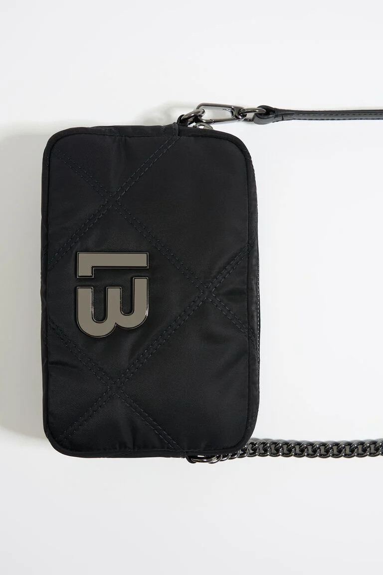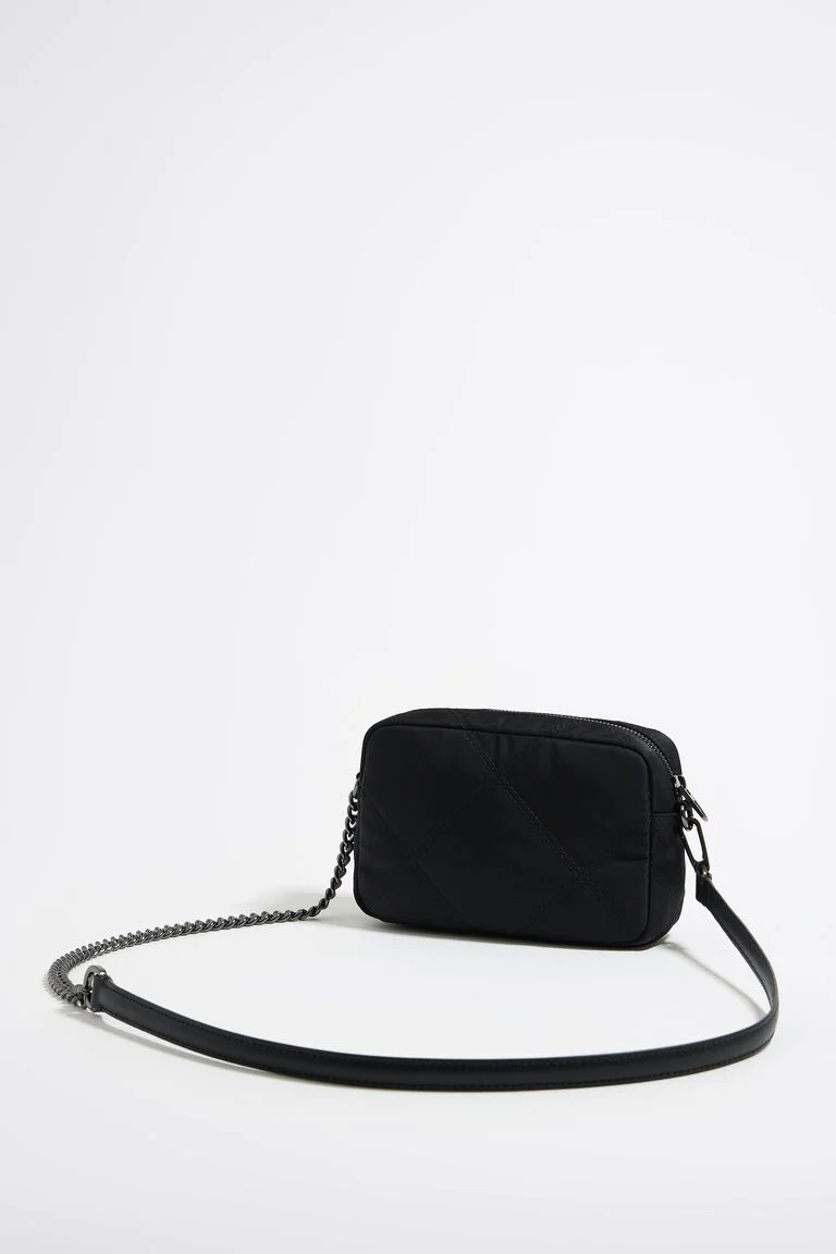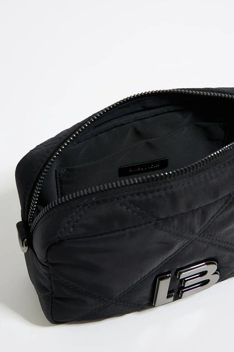 Bolso de nylon acolchado en color negro. Modelo de tamaño mini, cierre de cremallera, asa larga de piel y cadena, y bolsillo interior. Exterior personalizado con logo LB. Este modelo contiene 100% Poliéster reciclado.